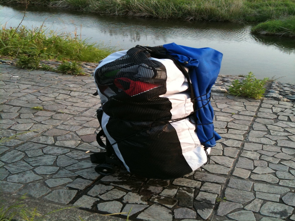 パタパタ畳んで、ライフジャケット・パドル・荷物などをキャリーに乗っけたらこんな感じ。