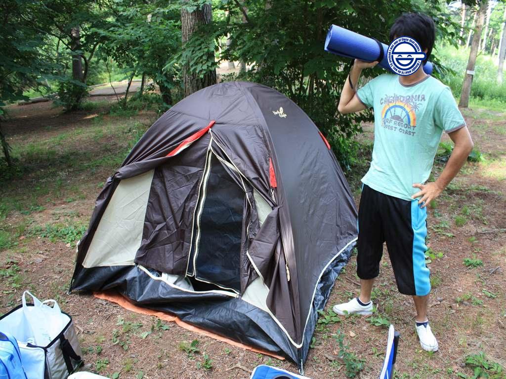 ・サイズ比較。マイミクの星野に立ってもらってこんな感じ。小さくもなく大きくもなく、ほどほどな感じが良い。天井は低いが、ねるだけだから全く問題な し。つかテントで立たないって…。