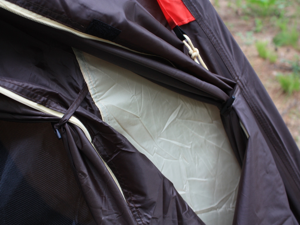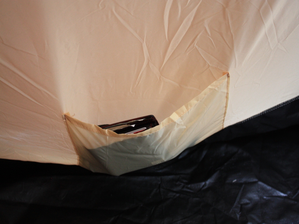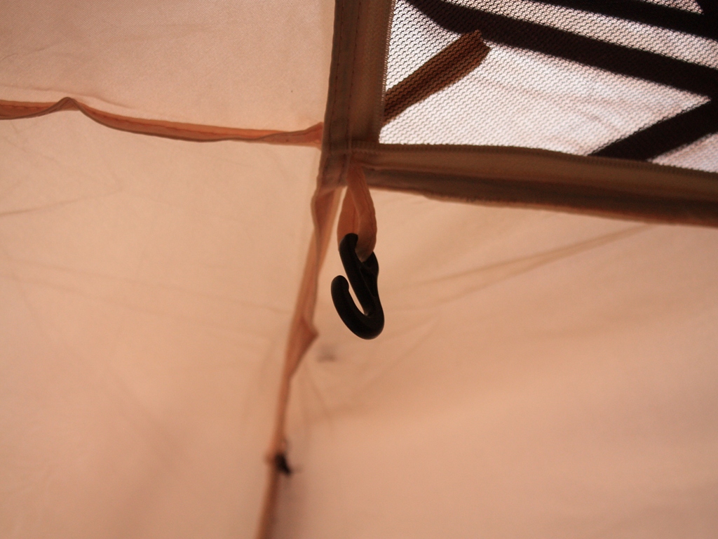 大型ベンチレーションが天井に設けられており、フライシートには空気穴がある。 室内には小物入れが2つ両側についており、ランタンフックも装備されている。 まくり上げた出入口をしっかり止めることが出来るフックがそれぞれ付いている。
